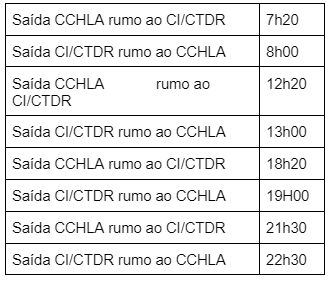 Desta forma, a primeira viagem em direção ao bairro de Mangabeira parte do Centro de Ciências Humanas, Letras e Artes (CCHLA), às 7h20, com retorno às 8h. Há ainda saídas às 12h20, 18h20 e 21h30.